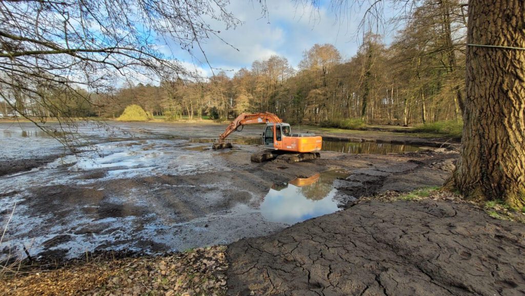 Am Rosenbornteich werden derzeit umfangreiche Baggerarbeiten durchgeführt, um das Gewässer grundlegend zu restaurieren. Ziel der Maßnahmen ist es, den Teich nicht nur optisch aufzuwerten, sondern auch ökologisch zu verbessern. Dazu wird das Gewässer unter anderem vertieft und neu gestaltet.